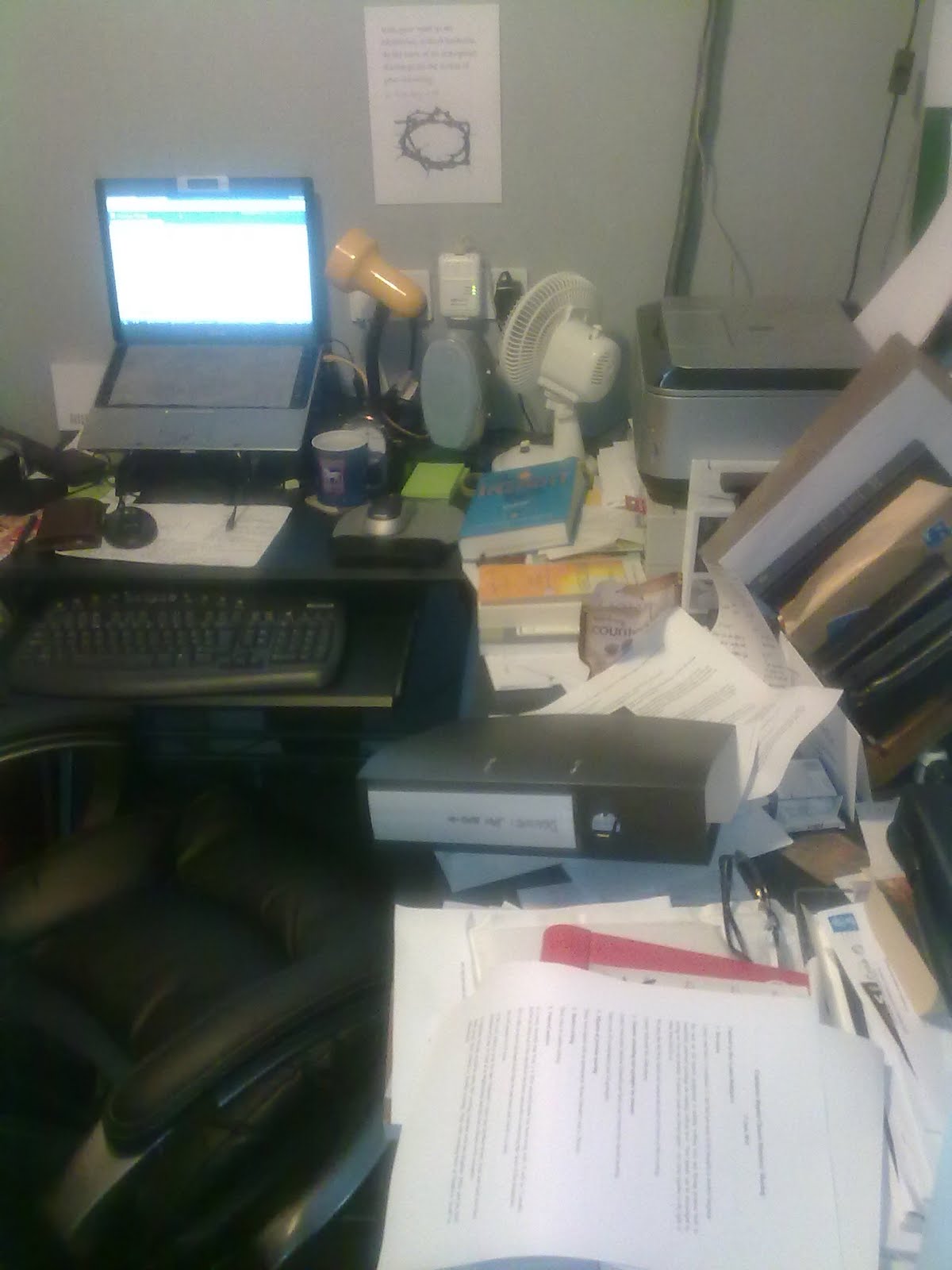 My study is a bit of a mess at the moment. I think it’s the result of me not working in it properly for about a month so I have dumped stuff in piles, in ‘in trays’ and anywhere there is space. The piles have started getting tall enough to fall over. I sense that it is important right now for me to do some tidying in order to enable me to work more efficiently (or at all!).