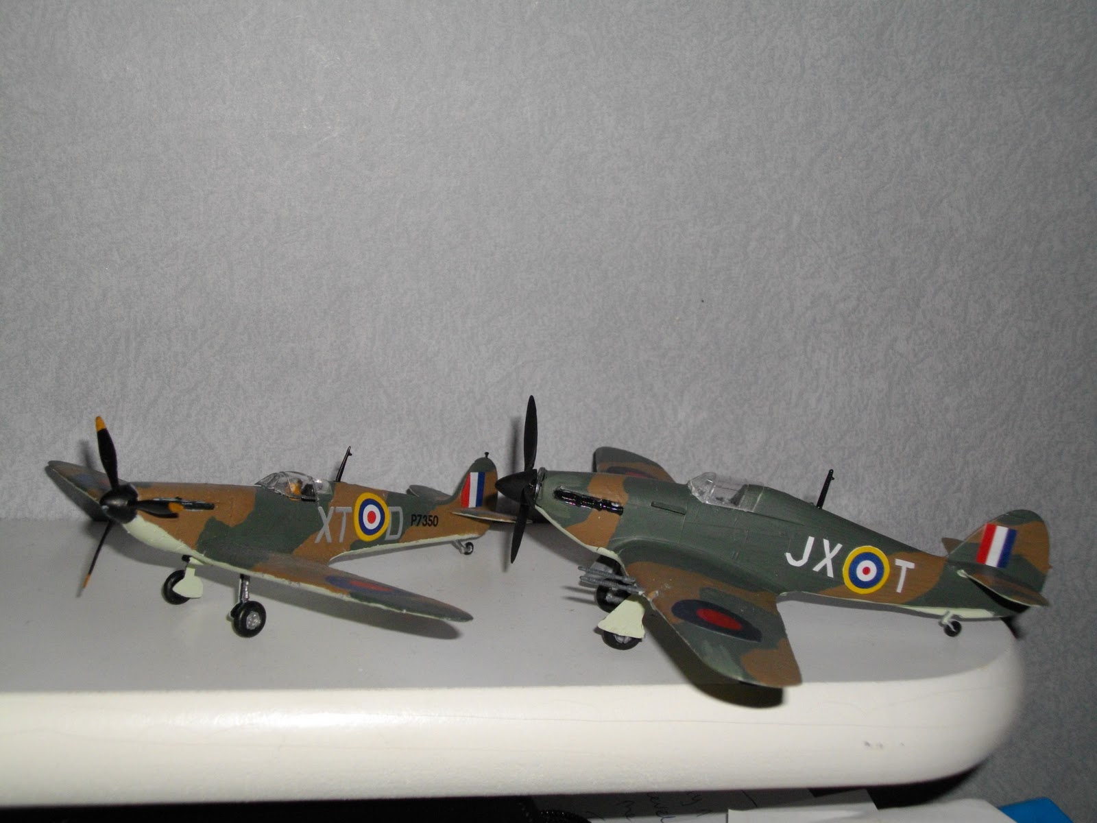 The difference is that on the Hurricane (one on the right for those not aware which is which) the stickers with the flag, squadron markings and RAF roundels are home made, whereas the ones on the Spitfire are the ones supplied with the kit.