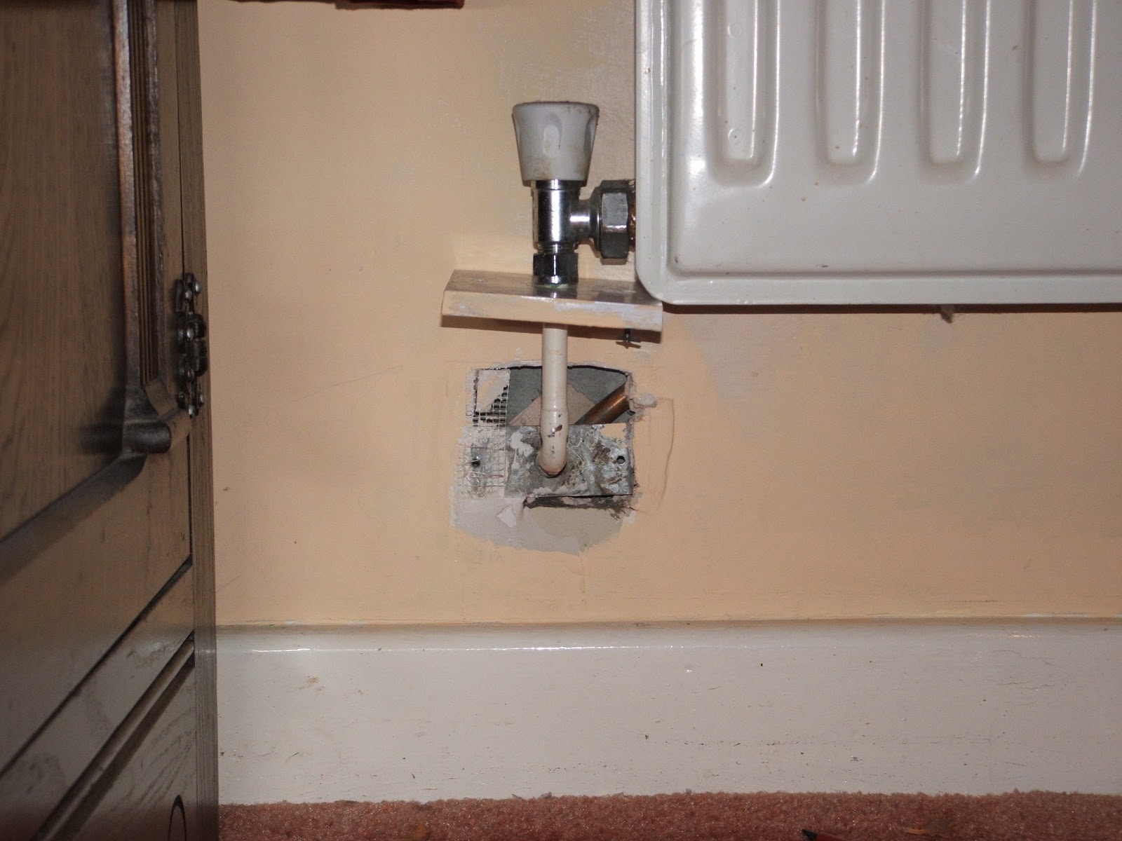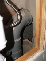 When we heard Sandy nearby we shone light into them but she never came out. After several days we were worried that the scrabbling might stop. At midnight Sally called to me and said she could hear Sandy in the cavity wall between our bedroom and bathroom. I went into the bathroom and took off the access panel underneath the sink. I could hear Sandy just the other side of some plasterboard so I pulled it off and looked in. A small hamster head poked up and I grabbed her quick!